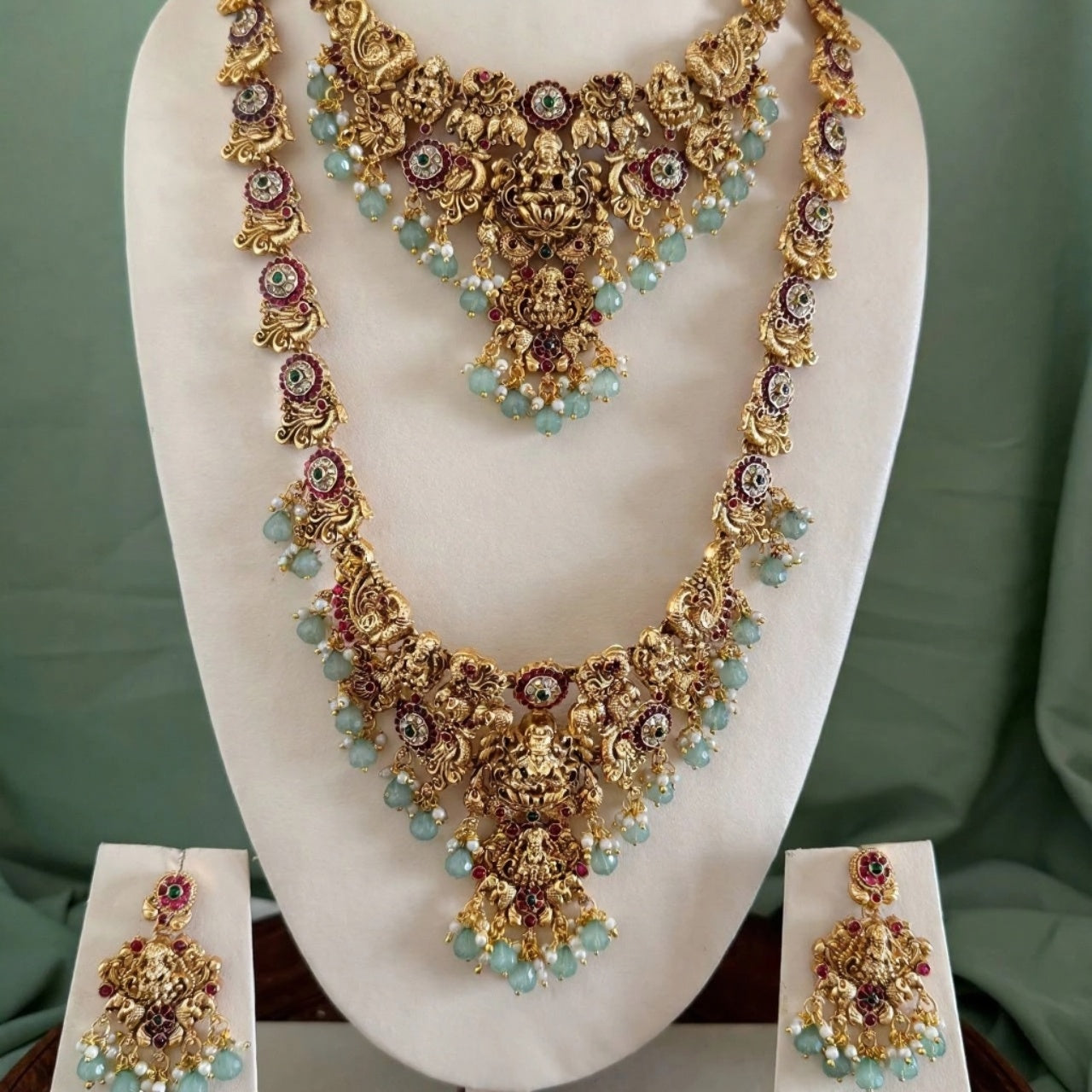 This necklace for the bride on her wedding day is a beautiful blend of antique and traditional designs. It’s a perfect bridal necklace for women who appreciate the charm of vintage jewelry. The emerald accents add a unique touch, making it a standout piece.
