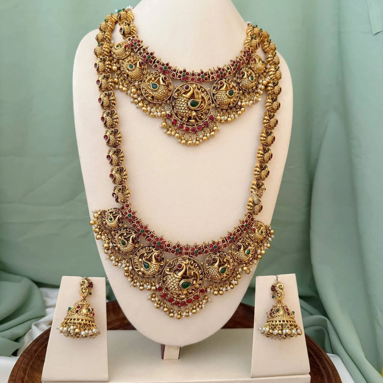 This necklace for the bride on her wedding day is a beautiful blend of antique and traditional designs. It’s a perfect bridal necklace for women who appreciate the charm of vintage jewelry. The emerald accents add a unique touch, making it a standout piece.
