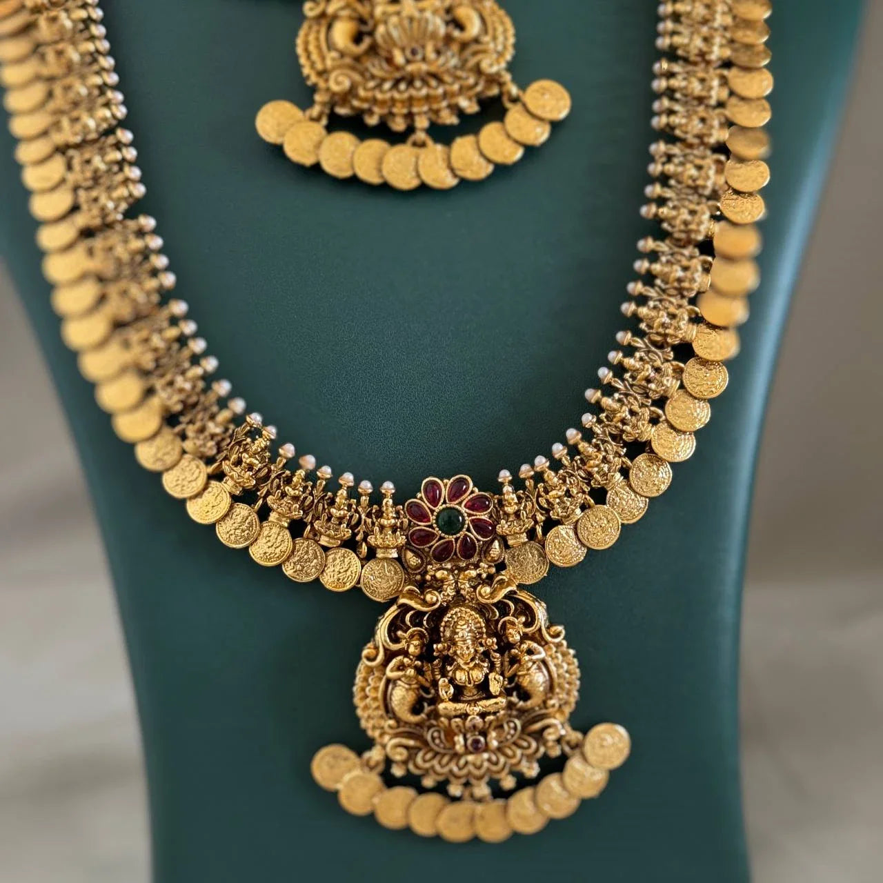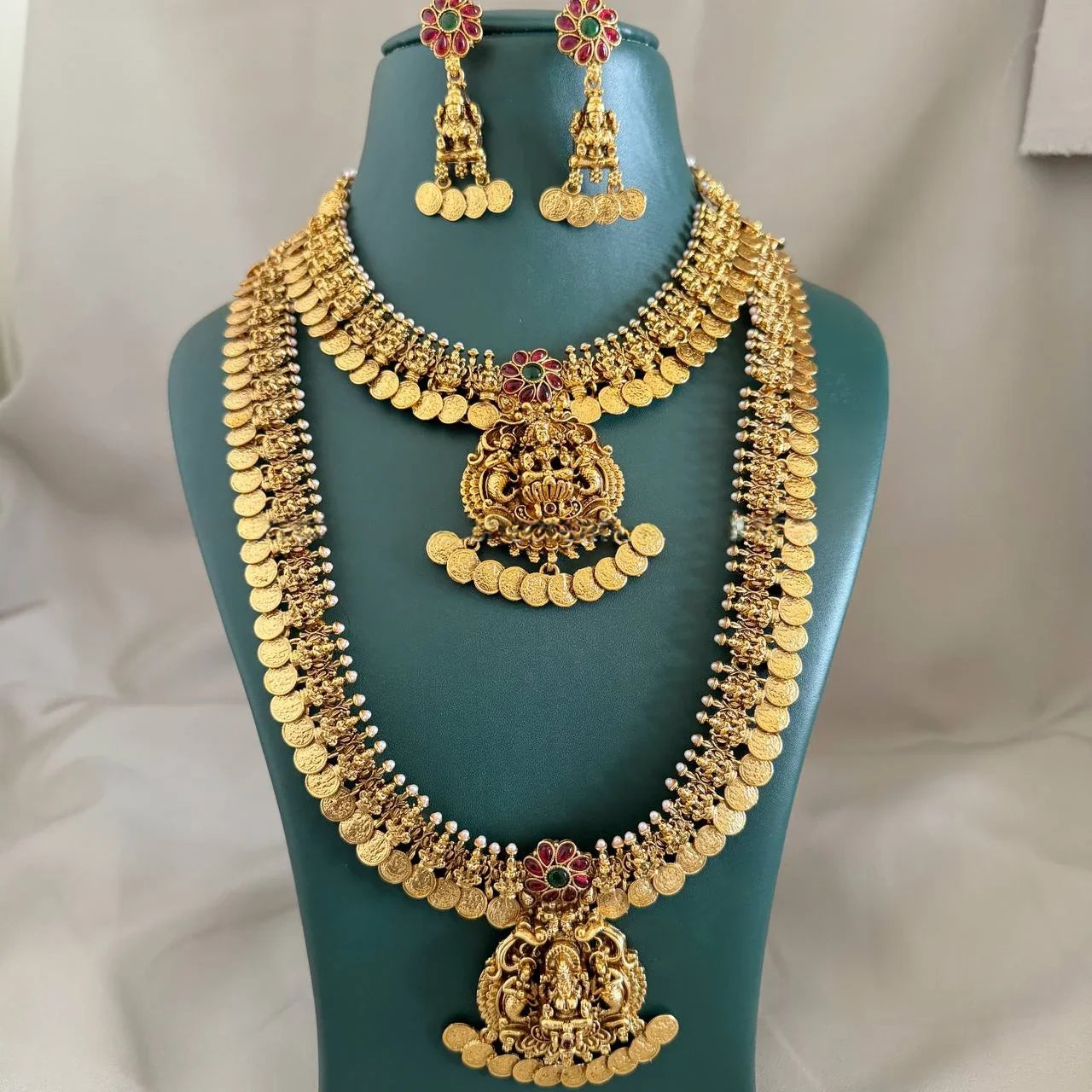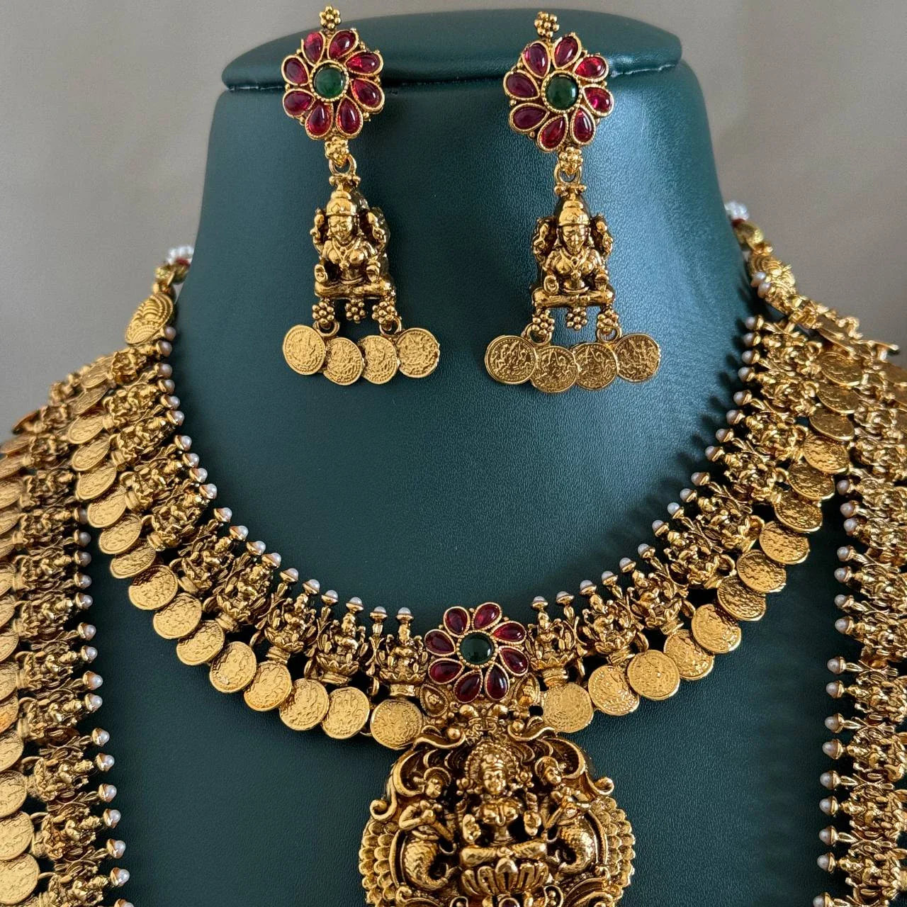 This necklace for the bride on her wedding day is a beautiful blend of antique and traditional designs. It’s a perfect bridal necklace for women who appreciate the charm of vintage jewelry. The emerald accents add a unique touch, making it a standout piece.