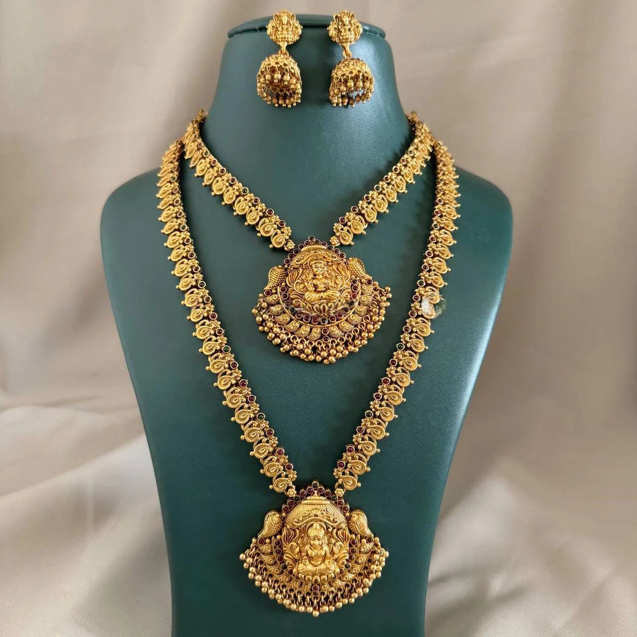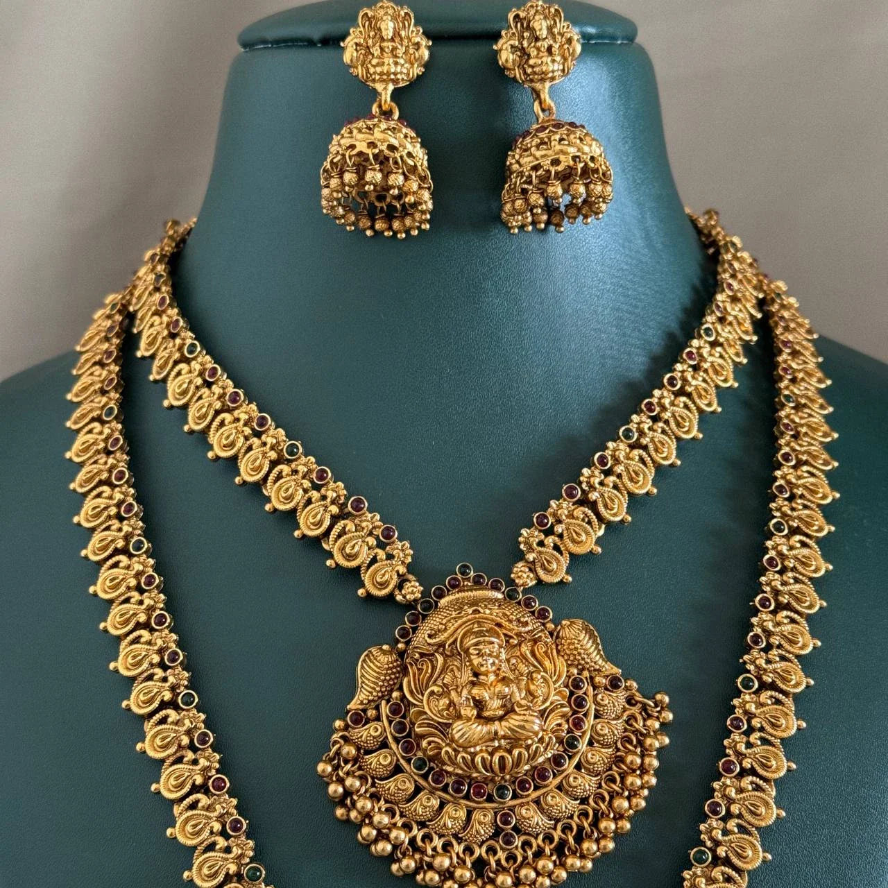 This necklace for the bride on her wedding day is a beautiful blend of antique and traditional designs. It’s a perfect bridal necklace for women who appreciate the charm of vintage jewelry. The emerald accents add a unique touch, making it a standout piece.