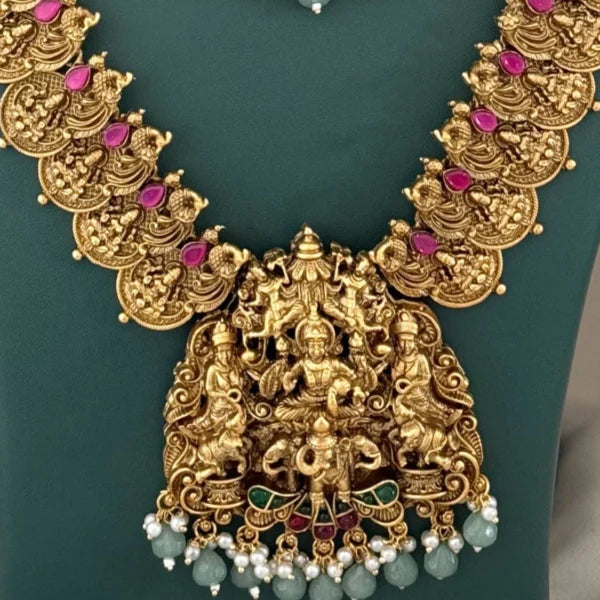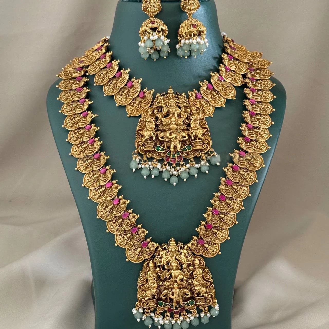This necklace for the bride on her wedding day is a beautiful blend of antique and traditional designs. It’s a perfect bridal necklace for women who appreciate the charm of vintage jewelry. The emerald accents add a unique touch, making it a standout piece.