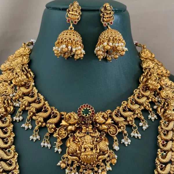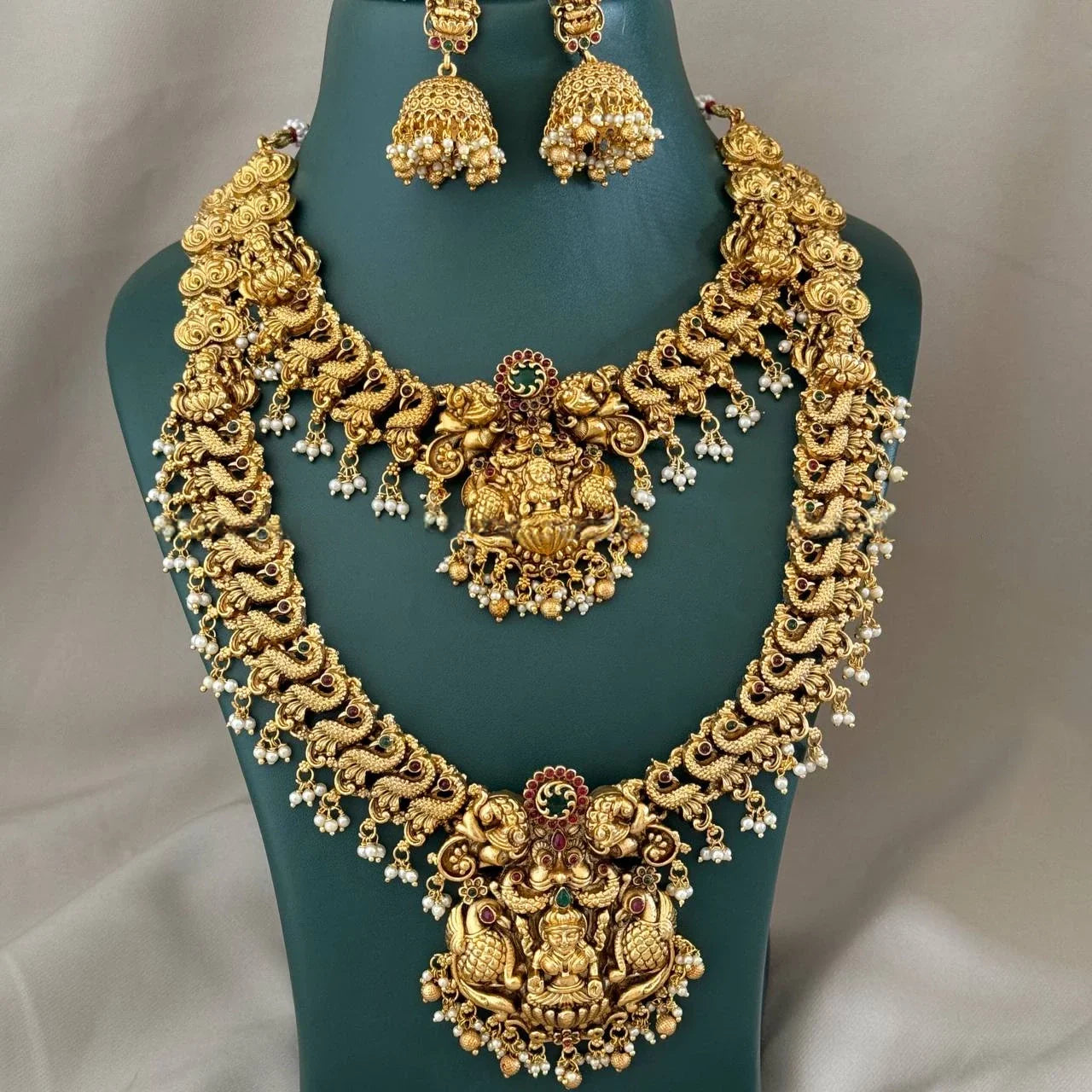 This necklace for the bride on her wedding day is a beautiful blend of antique and traditional designs. It’s a perfect bridal necklace for women who appreciate the charm of vintage jewelry. The emerald accents add a unique touch, making it a standout piece.