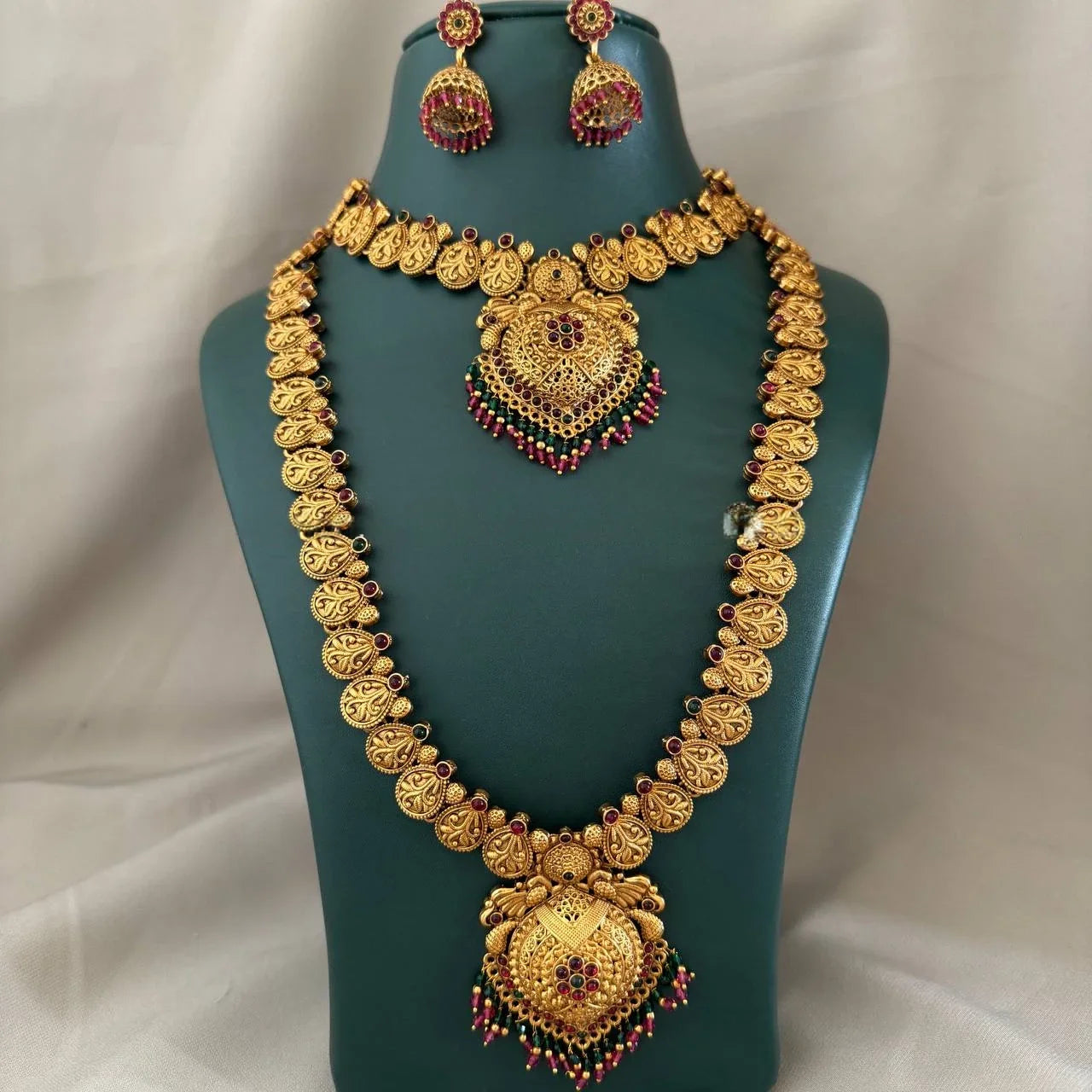 This necklace for the bride on her wedding day is a beautiful blend of antique and traditional designs. It’s a perfect bridal necklace for women who appreciate the charm of vintage jewelry. The emerald accents add a unique touch, making it a standout piece.
