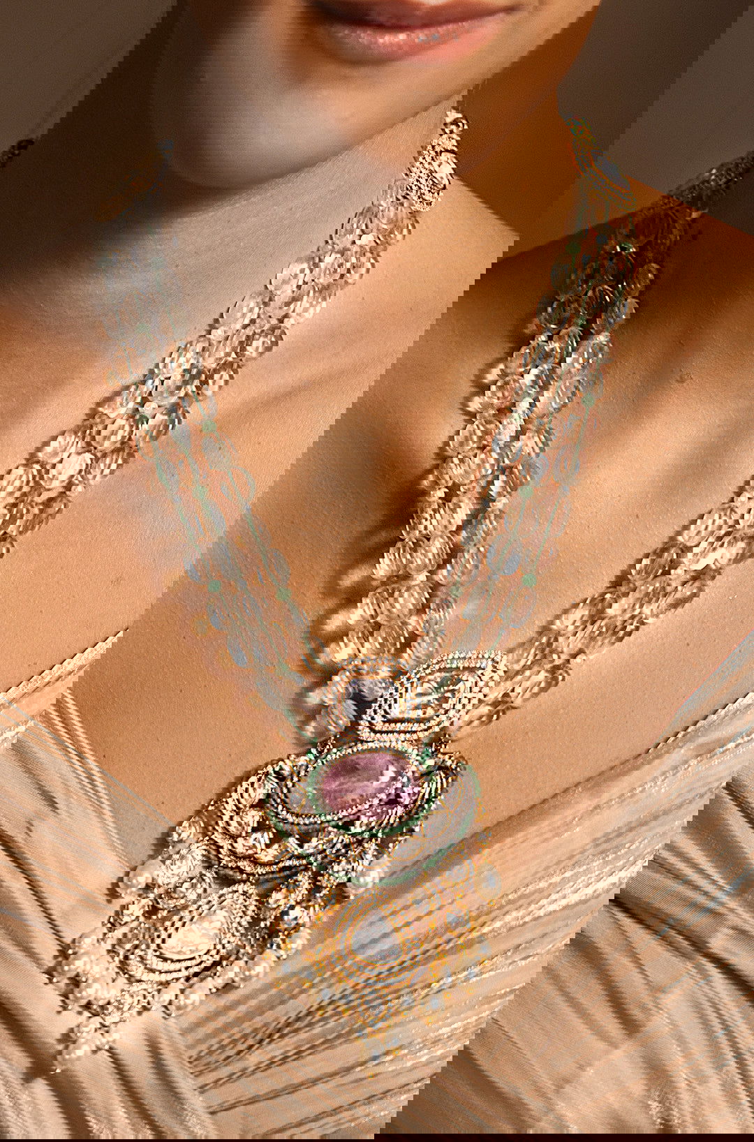 Description: Delicate brass necklace with yellow plating, adorned with golden, pink, and green stones. Features a draw string closure.