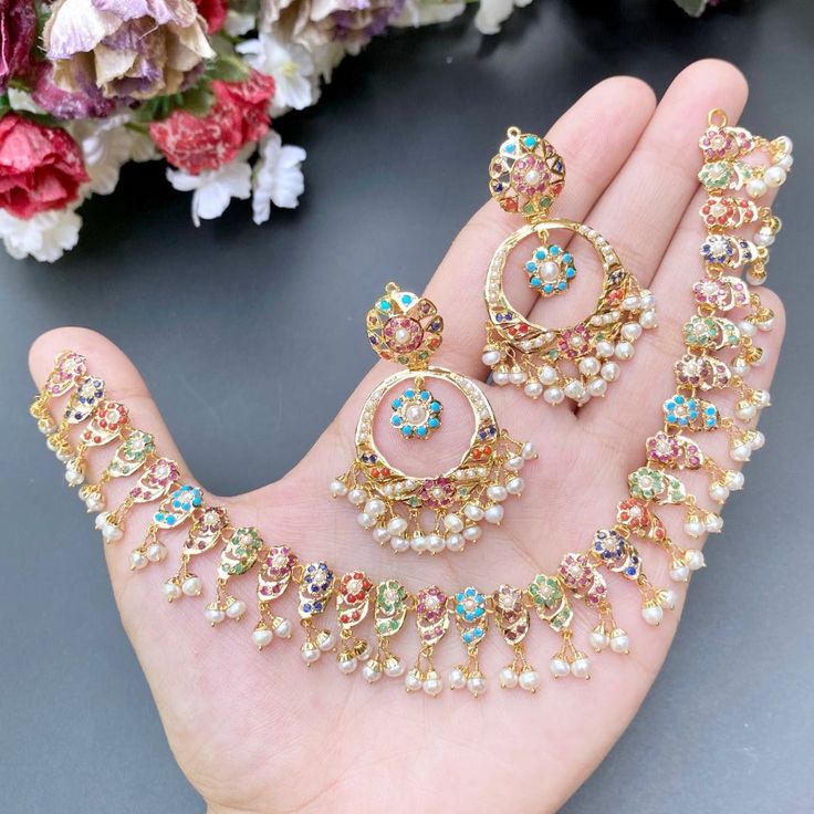 This beautifully crafted Gold Plated Navratna Set is both delicate and evergreen. The intricate detailing and use of nine auspicious gemstones make it a timeless and elegant piece of jewelry. With its gold plating, this set radiates luxury and sophistication, making it a perfect addition to any wardrobe. Elevate your style with the auspicious blessings of the Navratna Set.