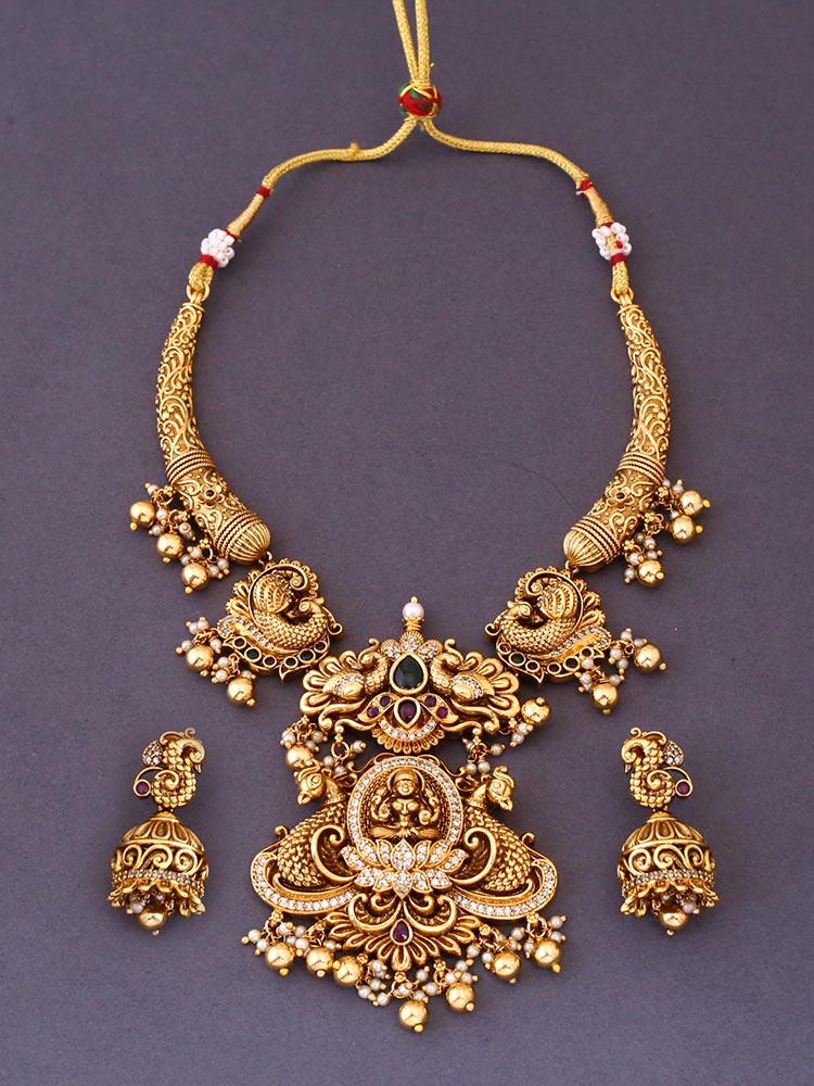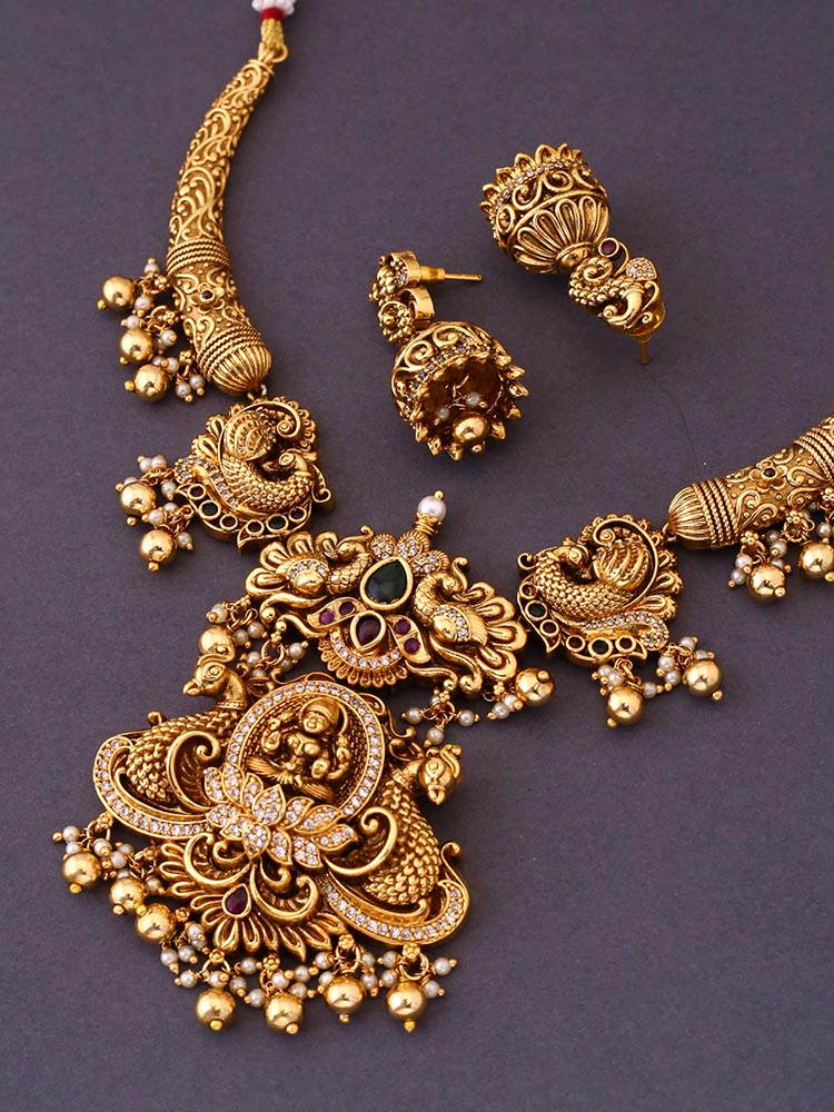 The temple necklace set epitomizes the grandeur and spiritual essence of Indian heritage, blending divine motifs with exquisite craftsmanship. Crafted with precision, each piece in the set showcases a harmonious blend of tradition and elegance.