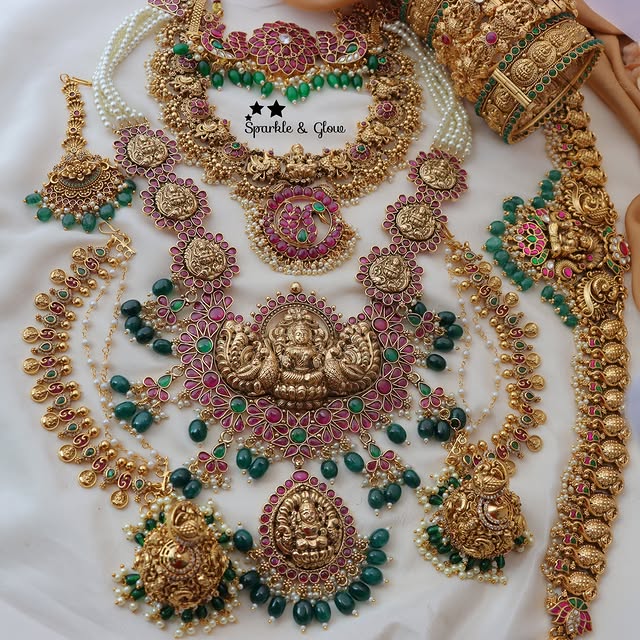 This Intricately Carved Idol Lakshmi Peacock Design Bridal Set showcases exceptional craftsmanship with detailed carvings of Goddess Lakshmi and elegant peacock motifs. Designed for brides seeking a blend of tradition and artistry, this set enhances ceremonial attire with its refined aesthetic and symbolic significance, making it a distinguished choice for auspicious occasions.