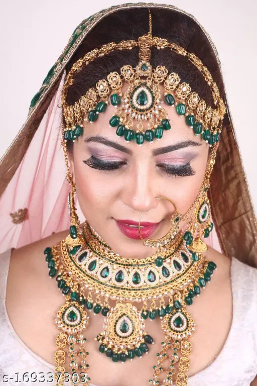 Traditional Kundan & Pearl Studded Dulhan Set Bridal Jewellery Set.this jewellery set is crafted in gold plating and consists of a necklace, mathapatti and a pair of earrings, nose ring/nath, Bajubandh, pair of hathpool/panja. The bridal Jewellery Set necklace feature kundan-studded in it and is secured with a drawstring closures. Style this Dulhan set with a saree or lehenga on your wedding day to enhance the look. Kundan Bridal set jewellery.