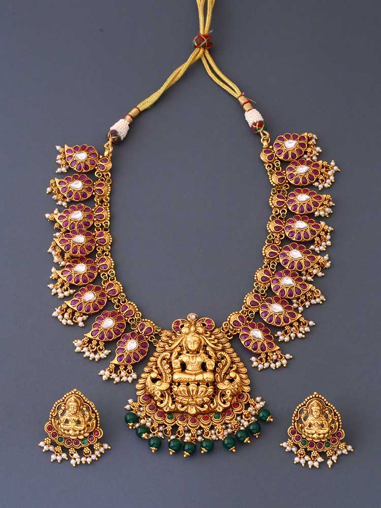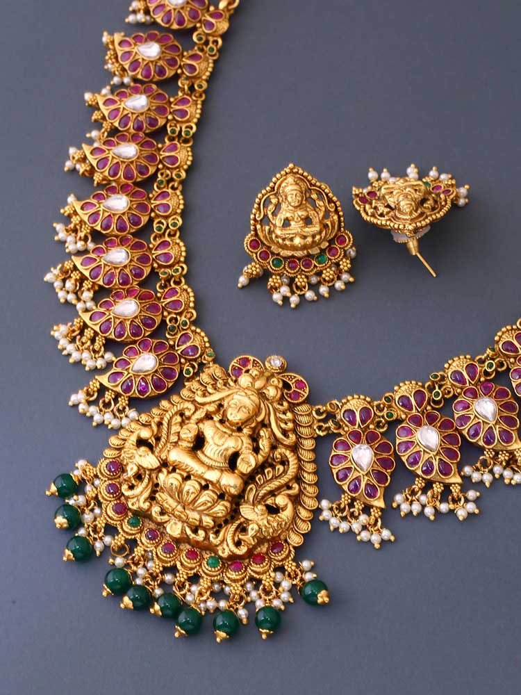 The temple necklace set epitomizes the grandeur and spiritual essence of Indian heritage, blending divine motifs with exquisite craftsmanship. Crafted with precision, each piece in the set showcases a harmonious blend of tradition and elegance.