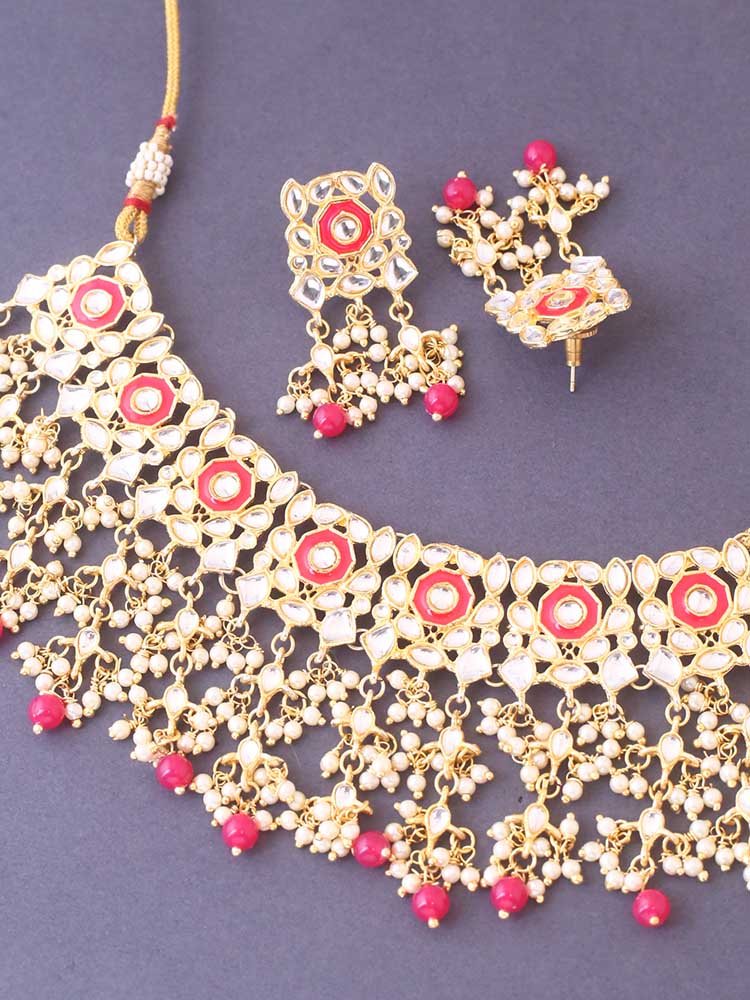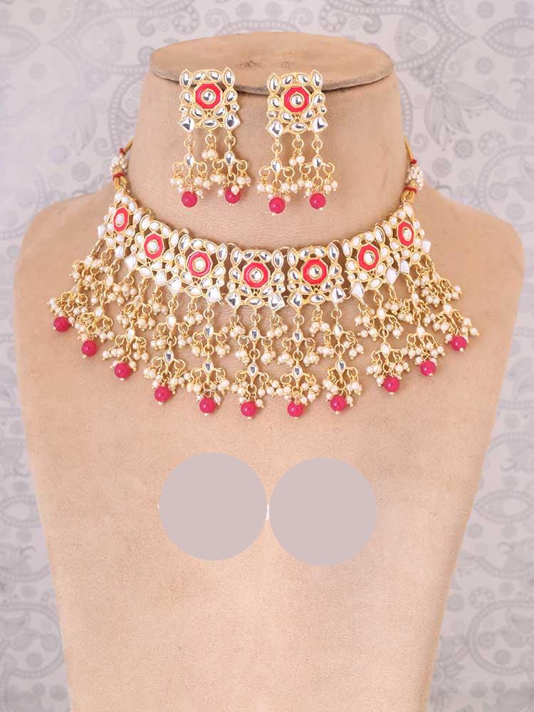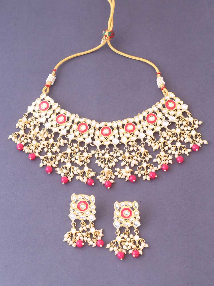 This necklace is the ultimate accessory option for the festive season. This set has a gorgeous circular floral pattern. The necklace has vibrant pearl detailing all over. The set also has a bright element of Kundan detailing in its structure. So, don't miss out on this gorgeous necklace set this eventful season as you have ramps to walk ahead.